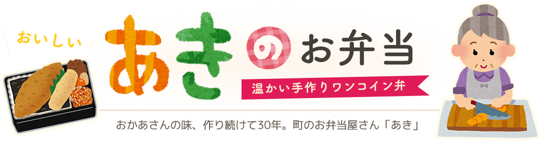 『あき』はお客様に、ご自宅で美味しいお弁当を食べていただく事、お客様「おいしい」の笑顔が『あき』の喜びです。